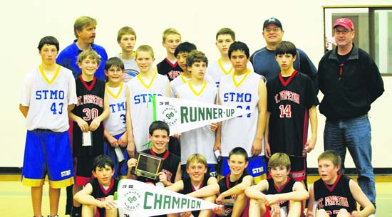 | | St. P's 6th grade Champions: Seated: Casey Harrington. Standing (left to right): Coach Ed Saribay, Zach Stromberg, Tyler Petite, Joey Hewitt, Matt O'Reilly, Kevin Hull, Scotty Fox, Head Coach Rob O'Reilly, Sam de Roque, and Calvin Saribay. Not Pictured: Kian Simpson Photo Teresa Saribay