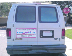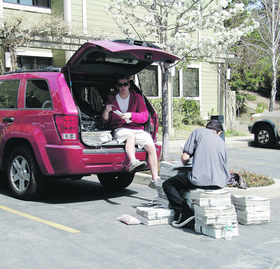 First delivery day! The 11 delivery teams prepared their loads of papers on the parking lot of the Moraga Town offices (our thanks to the Town.) I remember one phone call from a concerned citizen in Lafayette: "...they are throwing the papers all over the place!"