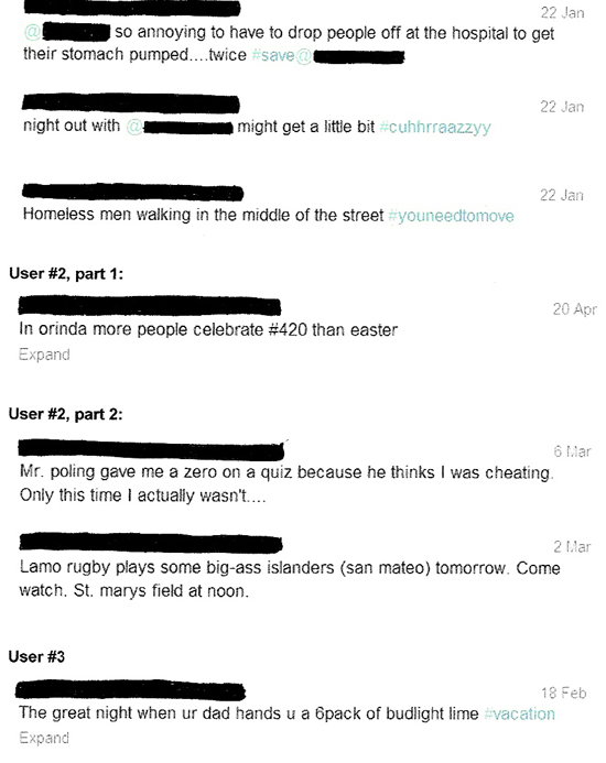 | Published May 9th, 2012 | Managing Your Child's Reputation in the Digital Age | Laurie Snyder |  | Tweeting teens can not only hurt their own images, but can inadvertently stain the reputations of family and friends. Many are unaware that they have been mentioned in questionable posts by someone they trust. (The names of the Twitter users and their friends and families have been blacked out.)