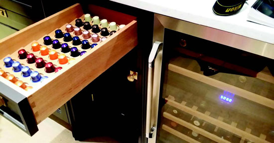 | One detail in this kitchen was irresistible: a custom drawer for coffee pods. Over the top? Yes, but oh so fun for this orderly girl. |