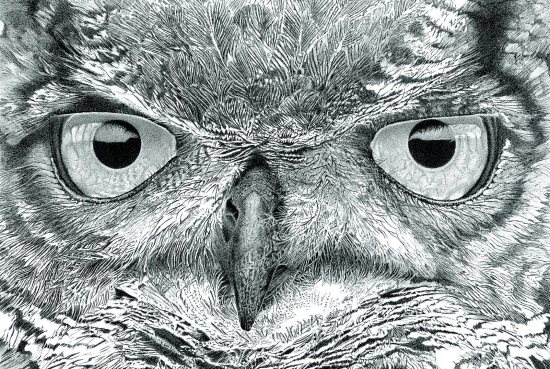 The self-taught artist never received any formal art education except for a few art classes. Both of his parents had artistic interests and supported his drawing interests as a child growing up in the Sierra Foothills. He started pen and ink drawing seriously in 2011, working at first on a small scale as many pen and ink artists do. Now his pieces are large, about 30 by 40 inches, and can take up to 200 hours each to complete. Using a very fine-tip radiograph pen and making thousands of small marks on cotton paper, he uses a combination of soft and dark strokes to achieve the realistic renderings of birds and other animals. One of his favorite subjects is his 18-year-old cat Shasta (named for Mount Shasta).