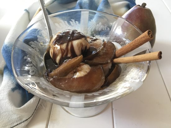 Serve the warm pears over vanilla ice cream and spoon the syrup over all. Garnish with a cinnamon stick.