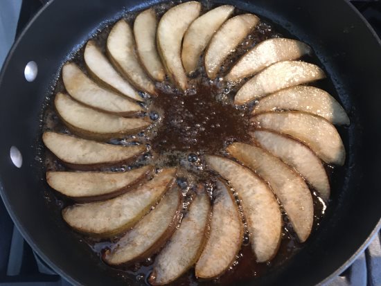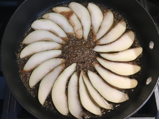 Arrange pear slices on top of the butter brown sugar mixture, and cook over low heat for approximately 12-15 minutes per side, or until just beginning to turn golden-brown. Add 1 cup of juice and simmer over low heat for 30 minutes or so, until the pears begin to caramelize. The juice will reduce down and thicken to a syrup during this process.