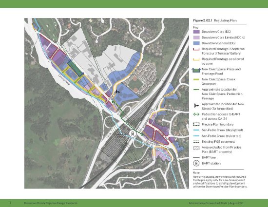 | | Published December 8th, 2021 | Laborious work continues on updating Orinda housing element to meet huge challenges | | | By Sora O'Doherty |  | | Figure 2.02.1 Regulating Plan, www.planorinda.com/ | As the population of the state of California edges ever closer to 40 million, concerns about providing housing continues to be a major issue at both the state and local level. Every local government is required by the state to have a "housing element" in the general plan and it is required to be updated every eight years. While local governments are not required to actually provide housing, they are required to make certain that local zoning provides the possibility of building a certain number of housing units. This number is assigned to local governments in the Bay Area by the Association of Bay Area Governments.