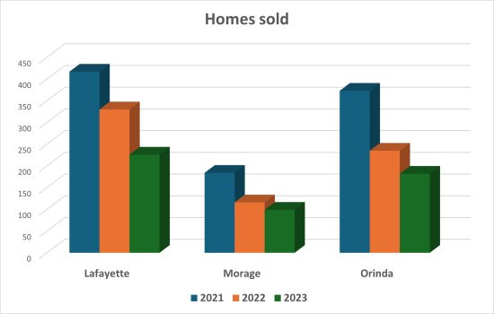 It was an interesting year for buyers and sellers of residential real estate during 2023 in Lamorinda. The higher interest rates as well as a lack of supply kept the number of transactions down for the year. Sales volume was much lower in each community and the average sales price in each community moderated somewhat.