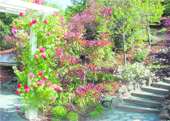 So what are the fire smart ideas? Deciduous trees are generally more fire resistant because of higher moisture content when in leaf and lower fuel volume when dormant. At maturity, trees can be very tall, so remember to factor their mature size into your overall design and keep their branches a minimum of 10 feet from any chimneys. Rocks, bricks, boulders, and fences constructed of non-flammable materials are fire retardant elements in a garden. Water features including ponds, pools, fountains, even dry creek beds are fuel breaks as are healthy green lawns. It may be tempting to leave your garden bare, especially in these times of water rationing, however, it is not recommended as soil erosion may occur.