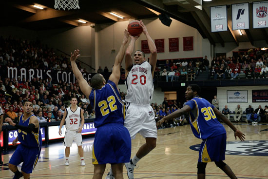 Senior Diamon Simpson shoots over San Jose defenders on the way to winning the first game of December's Shamrock Classic. (See related article) Simpson made Saint Mary's history in the January 2 game against CSU Bakersfield when he became the school's all-time leading rebounder with a defensive board at 7:21 following a missed 3-pointed by CSU Bakersfield's Bryan Emanuel. With that 917th rebound, Simpson surpassed Tom Meschery's school record 916 rebounds mark, which stood since the end of the 1960-61 season. Photo Tod Fierner