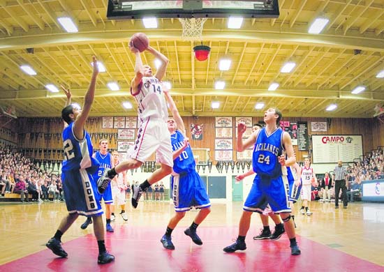 | Published February 4th, 2009 | Campo Defeats Acalanes in Moraga | By Conrad Bassett |  | Campo's Adam Mancebo goes for the lay-up surrounded by Acalanes defenders (L to R) Zach Bloom,