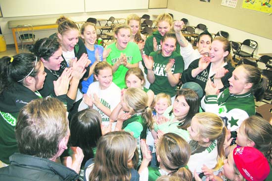 After the game several Santa Maria girls joined the Lady Mats in the team room for a question and answer session. The Santa Maria girls were pleased to learn that every Lady Matador player had played on a CYO team and most played for our hometown parish, Santa Maria, including Anderson, Johanson, Katz, McDonald, K. Miller, N. Miller, Reid and Rosenzwieg. Christenson played for Catholic Community of Pleasanton (CCOP) and Golden played for St. Bonaventure.