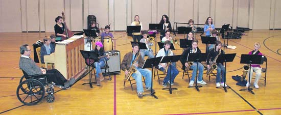 | The Stanley Middle School Jazz Messengers, directed by Bob Athayde and assisted by Tommy Davidson, visited all four Lafayette elementary schools to perform their Around the World in a Day tour. Although Athayde had suffered a recent back injury, he was present and in great spirits. Photo submitted by Krista McGuire
