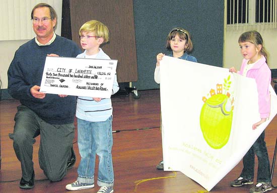 | From left: Lafayette Mayor Don Tatzin congratulating Oliver Rotundo, Christine Mlynek and Annika Sonne along with their parents, friends and neighbors (not pictured) who diligently worked to raise over $32,000 as a matching contribution for the Stanley-Springbrook Traffic Calming Project. For more information go to www.acalanesvalley.com