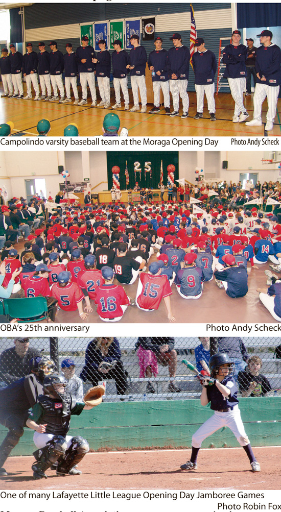 | Mother Nature cooperated quite nicely, offering up a sunny day for Lamorinda's youth baseball Opening Day on March 7. Most of the fields may not have been play-ready, but there were no damp spirits as teams were announced, anthems were played and first pitches were thrown. Boasting hundreds of boys and girls in each league, Moraga Baseball Association (MBA), Orinda Baseball Association (OBA), and Lafayette Little League (LLL), started their seasons off with festivals, jamborees and thunderous applause.