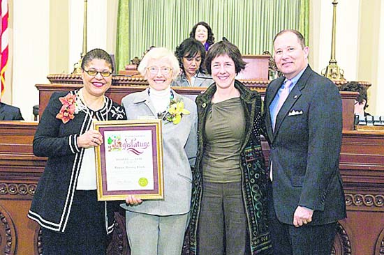 | In front of the entire State Assembly, Lafayette's own Louise Harvey Clark was named "Woman of the Year" for Assembly District 14, because of her lengthy history of service to the community. "She has long been an advocate for peace and justice, children, women and seniors and has proven to be a powerful force in our community," said Assembly Member Skinner in her tribute. Pictured from left, Speaker of the Assembly Karen Bass, Louise Harvey Clark, Assembly Member Nancy Skinner and Assembly Minority Leader Mike Villines