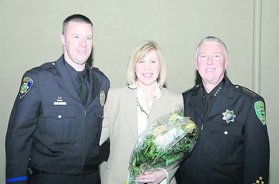 | Published April 29th, 2009 | Moraga's New Chief of Police Faces Local Challenges with Confidence | By Sophie Braccini |  | After he is sworn in, Chief of Police Priebe (right) poses with Tracy, his wife of 31 years, and his son Ron,