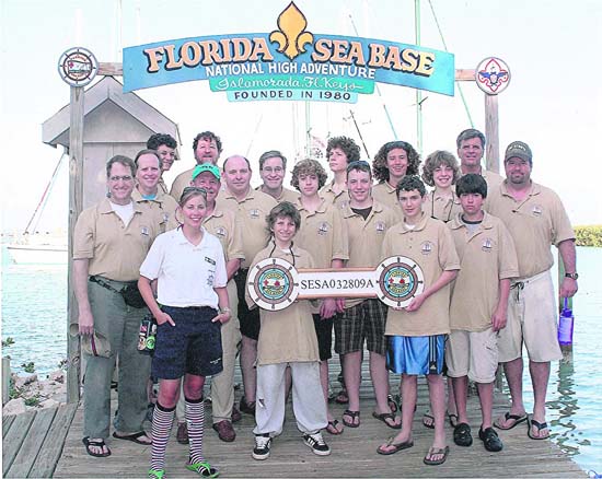 | Published April 29th, 2009 | Scouts Sail for Spring Break | Submitted by Fran Miller |  | | Nine Scouts and eight parents from Moraga Boy Scout Troop 212 spent six days during spring break sailing the Florida Keys on The Heritage Miami, a replica of the 1897 original 83 foot, gaff rigged schooner. Acting as deck crew, anchor crew, galley crew and nighttime anchor watch under the captain's command, the scouts learned to hoist sails and lash and splice lines. Pictured (L to R) at the Florida Sea Base; Back Row: Brandon Luecker, Chris Baker, Don Stephens, Ben Thomas, Andreas Del Valle, Cameron Bagley, Charlie Luecker, Rainer Del Valle. Middle Row: Bill Cimino, Gary Blouse, Rick Hazard, Dave Call, Rory Baker, Scott Call, Kevin Blouse. Front Row: Progam Director Rachel Metzger, Jim Cimino, Joey Lederman.
