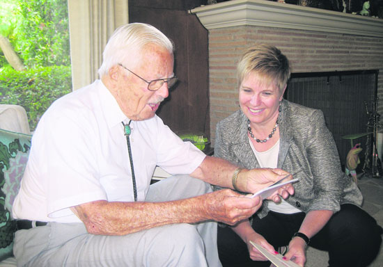 George Bruns, Jr., 90, looks over pictures of Bruns House 5th Anniversary Celebration with