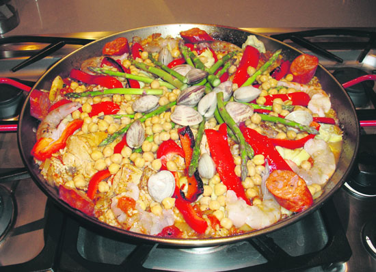 Commonly cooked over an open fire, paella is considered a delicacy, made with short-grain rice and vegetables, seasoned with saffron and most often including chicken, sausage and shell fish. But, originally, paella was a common meal for field laborers and since shell fish sightings are rare in the fields, it was usually made with chicken, rabbit, duck or snails.