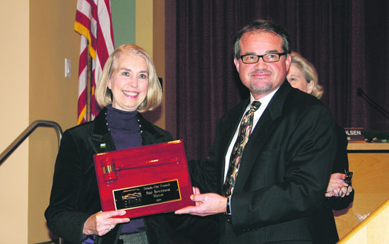 | | | Sue Severson receives recognition for her work over the past year as mayor from the newly