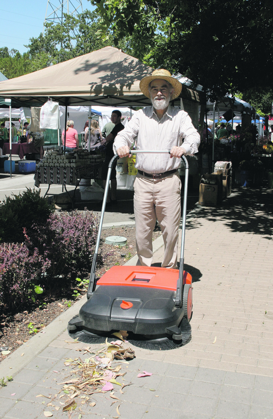 | Orinda resident Lawrence Burde gave the haaga, an eco-friendly sweeper made in Germany, a push through the Orinda Farmer's market last Saturday. Members of the citizen group, Quiet Orinda, were displaying the gadget to demonstrate the circular broom sweeping system as an alterntive to leaf blowers for cleaning up small debris.