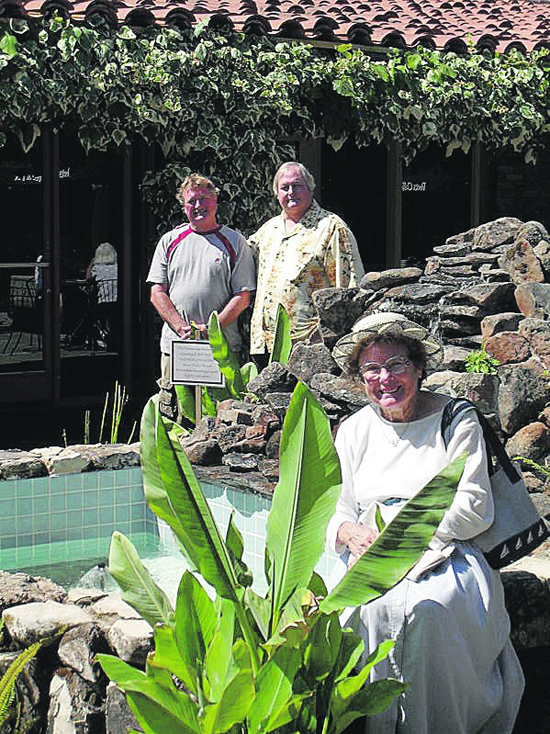 | On a sunny Saturday, Jef Raf, with Kim Robbins of Old World Masonry and Kim's brother Keith Robbins, put the finishing touches on a new fountain in the middle of the Lafayette Plaza Mall, behind Peet's. A gentle waterfall cascades down the newly installed rocks, providing a soothing backdrop for residents enjoying a coffee, bagel or frozen yogurt treat. Several young shoppers were armed with pennies, and presumably wishes, for the new fountain.
