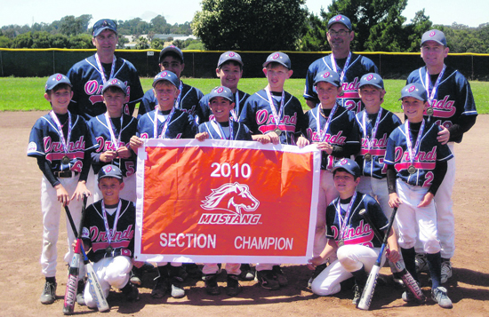 | Published August 4th, 2010 | Orinda Mustang 10U All-Stars Reach Pony Regional Semi-Finals | Submitted by David Reed |  | L-R: ( Front row) Ben Mollahan, Ryan Fenn; (Second row) Tim Tierney, Owen Reed, Sam Pinto, Jake Hassard, Teddy Hoxie, John Novogradac, Will Cassriel, Will Knox, (missing from photo: Chase Callister);