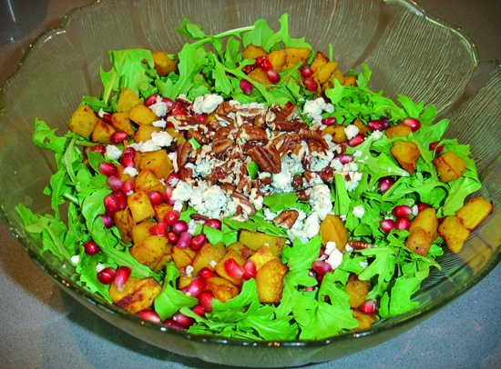 Arugula salad with roasted pumpkin, toasted hazelnuts or pecans, pomegranate seeds, bleu cheese and Blood Orange Vinaigrette
