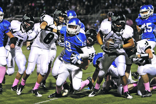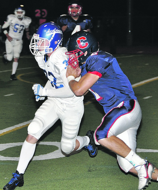 |  | The Matador's Christian Thatcher (2) ripped the ball out of the hands of Acalanes running back Aaron Edwards (19) and headed to the endzone for a touchdown. Photo Jordan Fong