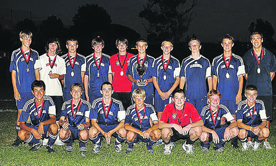 The Lamorinda Soccer Club's U15 FC 95 boys' team enjoyed an undefeated run through the HK Shootout in Fremont on September 25-26, capturing first place with a 2-0 win over Mustang United 95 in their final game. FC 95 started the weekend's pool play with a hard-fought victory over host Mission Valley United followed by a well executed 4-0 win over Bay Oaks Arsenal where FC 95's possession game was at its best. In a spirited 2-1 victory over South San Jose Elite SC FC 95 scored the only goals that South San Jose conceded all weekend. In combination with a stingy defense and sterling keeper play, the win proved to be the key contest of the weekend. In the championship game, FC 95 controlled the game with a goal in each half while goalkeepers Jeffrey Lefcourt and Keegan Murphy tallied their second clean sheet of the weekend. Afterwards, Coach Pedro Osorio presented Gus Keeble with the team trophy as FC 95's most valuable player of the tournament.
