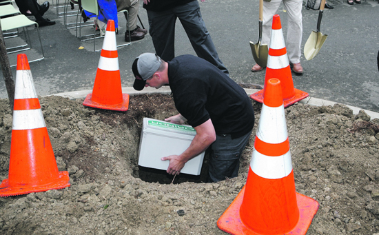 | Orinda Public Works Supervisor Bryan Rowe places the City's 25th Anniversary time capsule in its burial site on the island of the lower level parking lot at City Hall.