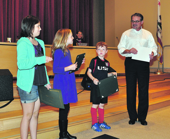 | Mayor Tom McCormick (R) recognizes the winners of the City's 25th Anniversary Poetry Contest (L to R) Veronika Pister, 6th Grade, Orinda Intermediate School; Chloe Morrison, 3rd grade, Glorietta Elementary; and Wade Beury, 2nd Grade, Del Rey Elementary.