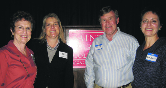 | Published October 27th, 2010 | New Development Director(s) for Moraga | By Sophie Braccini |  | Moraga's newest team attended the Chamber of Commerce Business Forum at SMC. From left: Chamber president Edy Schwartz, Mary Coe, Richard Larsen and Renée Zeimer. Photo Sophie Braccini | The Town of Moraga has a new Economic Development Director...or make that three. Town Manager Mike Segrest introduced the trio of volunteers at a business forum at Saint Mary's College, which was organized by the Moraga Chamber of Commerce and Mechanics Bank. Mary Coe, Richard Larsen and Renée Zeimer are the bold souls who have volunteered to tackle a Herculean challenge: promoting shopping in Moraga. A combination of diverse experiences increases their odds of success.