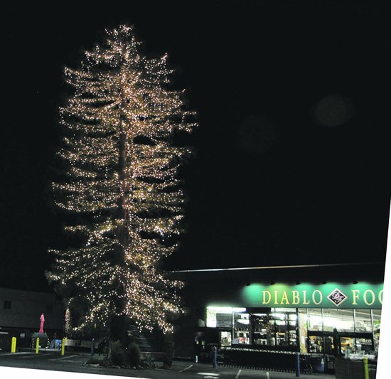 | Every November the proud redwood tree that stands in front of Diablo Foods lights up for the holidays. But not this year. Arborist Thomas Raeth of Lafayette Tree and Landscape, who has been taking care of the tree for 20 years, advised the Stokes family to give the tree some room to breathe, and not turn on the bright garland of lights enjoyed by passersby over the last several seasons.
