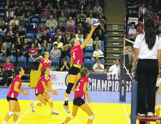 Photos Doug Kohen | After countless hours of practice, patience and determination, the Campolindo girls' volleyball team finally got what they rightfully deserved, the Division III state championship. The Cougars took down defending champion Cathedral Catholic, from San Diego, three sets to two on Saturday, December 4. Cathedral Catholic has played in the State Championship the last three years but Campo came prepared with a game plan that didn't need much alteration. Head coach Scott Bishop said, "Other than changing serving targets, we stuck to our game plan. We scouted them extensively."
