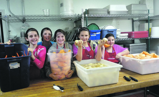 | Members of Moraga Girl Scout Troop 30734 recently spent several hours volunteering in the kitchen at the Bay Area Rescue Mission (BARM) in Richmond. The troop split into two groups, one going in November and the second in December (the December group is pictured.) After donning hairnets and aprons, the girls got to work peeling dozens of pounds of potatoes and carrots, serving meals to two waves of men, women and children, and washing dishes. The kitchen supervisor complimented the girls' efforts, thanked them for their hard work, and invited them back after the holidays - tired but happy, the girls agreed that they would definitely like to return to BARM and help out again.