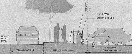 After much discussion about the pros, cons, expense and maintenance costs of four wall design options, Option 1 was decided upon. This choice had a growing consensus of shop owners along with city staff. It includes a low stone wall with a creeping fig vine on the shopping center side that allows the most room for parking. The current layout of the busy parking lot at the Happy Valley Shopping Center, home to Trader Joe's and Diablo Foods, encroaches onto city property, up to a foot and a half in places.