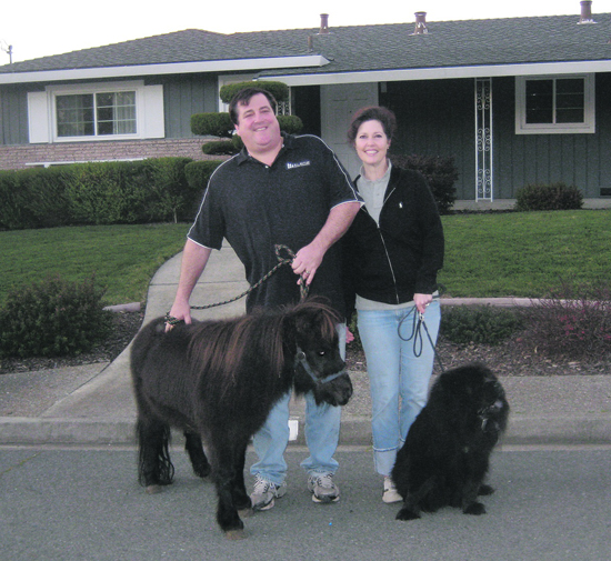 | Dennis and Sandra Chiodo walk their American Miniature Horse, Sam, in the streets of Moraga. Dennis gave Sam to Sandra 15 years ago as an anniversary gift. Miniature horses are not ponies, they can pull a cart, and some are presented in shows. Sam is just a friendly pet who loves people and needs to be walked regularly.