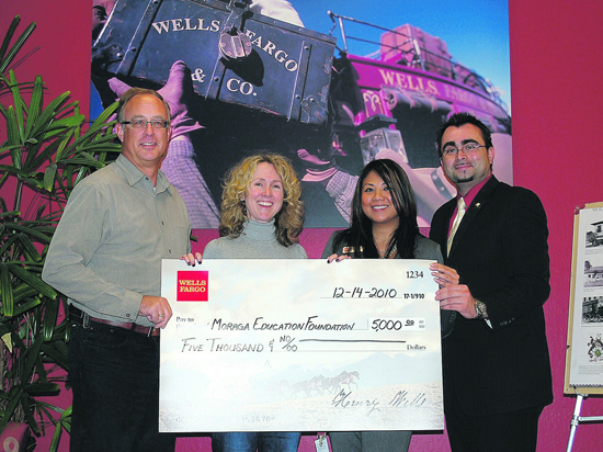 Wells Fargo Assistant Vice President of Community Banking, Arturo Gonzalez, and Geri Echague, Assistant Manager of the Wells Fargo Moraga branch presented the Moraga Education Foundation (MEF) at the end of 2010 with a $5000 Education Grant check. MEF President, Diana Obrand and MEF's Chairman of Business and Community Partners, Eric Andresen (left) were pleased to nominate Wells Fargo their newest Community Partner. The Education Grant is part of Wells Fargo's commitment to community development and support. Presenting the check for The Moraga Education Foundation provides significant funding to local schools, supporting counseling, arts, music and science programs, as well as promoting community involvement in our schools.