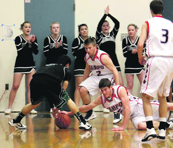 | Published February 16th, 2011 | Campolindo Basketball Defeats Lamorinda Rivals | By Conrad Bassett |  | Mats' Kazz Tamura and Campo's Alan Hickey fight for a loose ball. Photo Jordan Fong