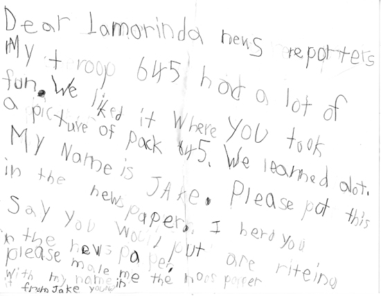 | The 1st grade Cub Scouts of Lafayette Pack 645 paid us a visit on Friday, January 21. We had a great time with them, and received a nice thank you note from Cub Scout Jake. You're very welcome, Jake!
