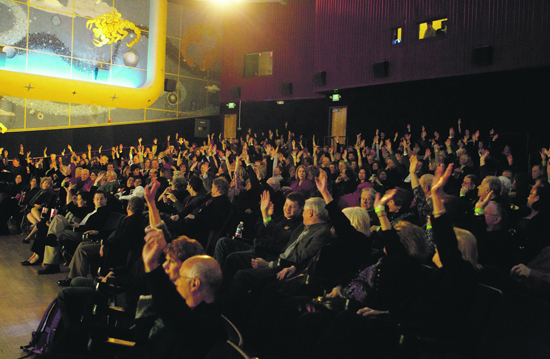 | Published February 16th, 2011 | The Economics of a Festival | By Sophie Braccini |  | Moragans raised their hands when prompted on opening night Photo Doug Kohen