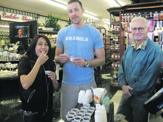 Matt Teichmann and Dan Miskie offer samples of their granola to customers at Diablo Foods