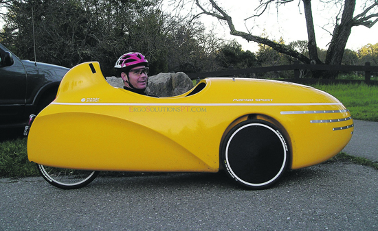 | Look, up ahead! Is it a kayak? Is it a plane? Is it a banana? No, it's Greg Thomas in his yellow velomobile! A velomobile is a three-wheeled recumbent bike (two-wheel steering in front) covered in a fiberglass shell. Thomas currently rides a Dutch built Mango Sport model, which weighs 65 lbs and is 8 feet long.