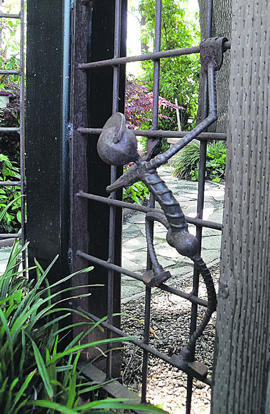 A custom-designed fence with laser-cut leaves and dainty frogs graces the front of the ranch- style home. A side gate incorporates wood and metal along with a recurring leaf motif that uses a uniquely positioned golf club shaft as part of the closing mechanism.