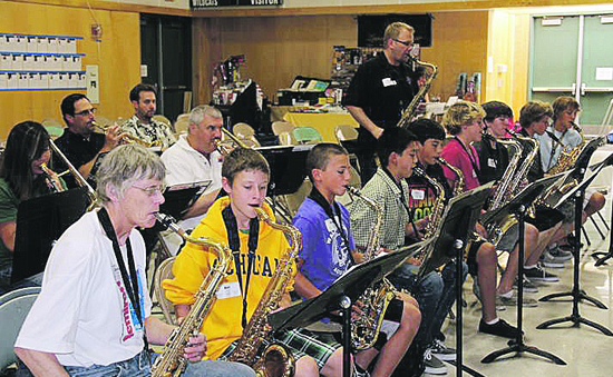 Mary Fettig, legendary Bay Area saxophonist and the first woman to play with the Stan Kenton Orchestra leads students in Big Band music at the Lafayette Summer Music Jazz Work shop. Photo Cathy Tyson