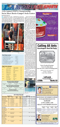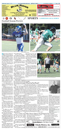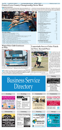 Page B2 - B3 Contra Costa County Championship Swim Meet Water Polo Club Continues to Win Lamorinda Soccer Clubs Finish in First, Second Place Football Season Preview