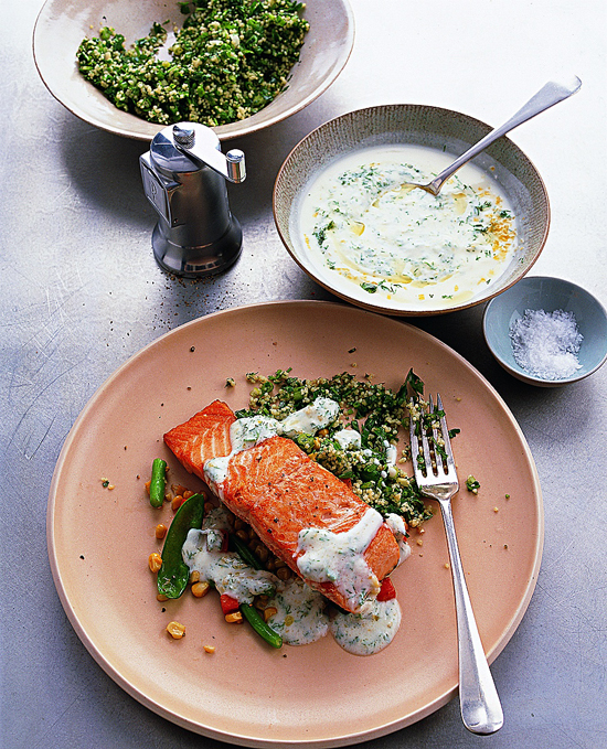 To serve, arrange vegetables around salmon fillets and spoon yogurt sauce over fillets. Serve warm with couscous.