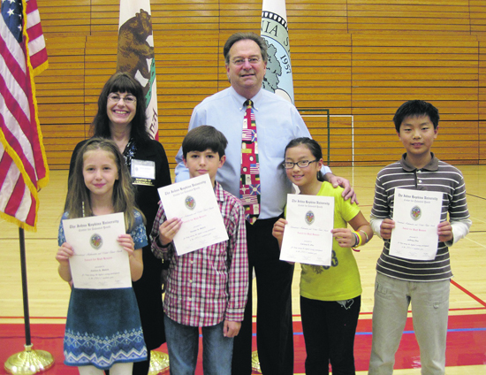 | Front row, from left: Aislinn Welch, Hunter Welch, Carissa Zhu, and Jeffrey Zhu, all students from Moraga, were recently honored as some of the brightest young students in the nation at a statewide awards ceremony for gifted children sponsored by The Johns Hopkins University Center for Talented Youth (CTY). The students are pictured with CTY Master of Ceremonies Valerie Patten, M.C. and Lawrence Bliss, Director of Academic Advising and Career Education at Cal State Hayward. Foe more information on CTY go to www.cty.jhu.edu.