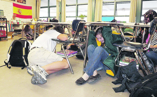 It was business as usual in Carla Unroe's third period Spanish class until the word came to duck and cover ("terremoto" is "earthquake" in Spanish). One student took his job so seriously that he became wedged underneath his desk and needed help getting out. The students then grabbed their backpacks (a concession because this was a drill; in a real emergency they'd leave their possessions behind) and headed to the football field with the rest of the student body. Teachers hung green door markers ("all accounted for") before heading out; if a student was injured or unaccounted for the teacher stayed behind and hung a red marker.