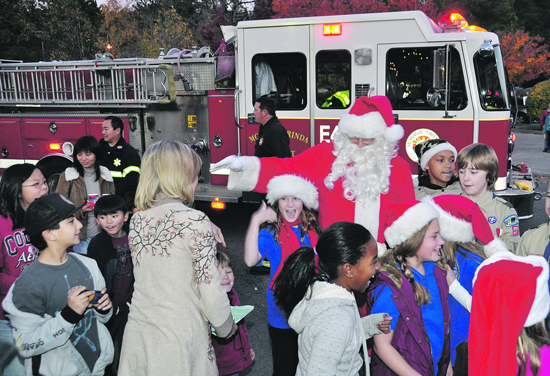 Children vibrated with excitement as Santa arrived by Moraga-Orinda Fire District truck. Bounding down from the cab, he waved as he made his way through the crowd. He greeted his biggest fans from his place of honor for more than an hour with help from members of Boy Scout Troop 237.