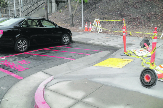 | The handicapped ramp issue reported on in the October 12 issue, Handicapped Ramp Inaccessible to Disabled BART Patrons, is now partially remedied. The south side of the BART station had a $2 million ramp completed in April, but until relatively recently there were no curb cuts or handicapped parking spots for folks with mobility issues to get to the fancy new switchback ramp leading to the station. Now there is a curb cut, with adjacent 'no parking' space outlined in red, but there are still no handicapped parking spots in that lot. On a recent day, the curb cut didn't look that welcoming with construction cones and yellow tape nearby. BART spokesperson Jim Allison reported that the handicapped parking requirement for the station had already been met with conveniently located spots in the north lot, a short and flat distance from the station. C. Tyson
